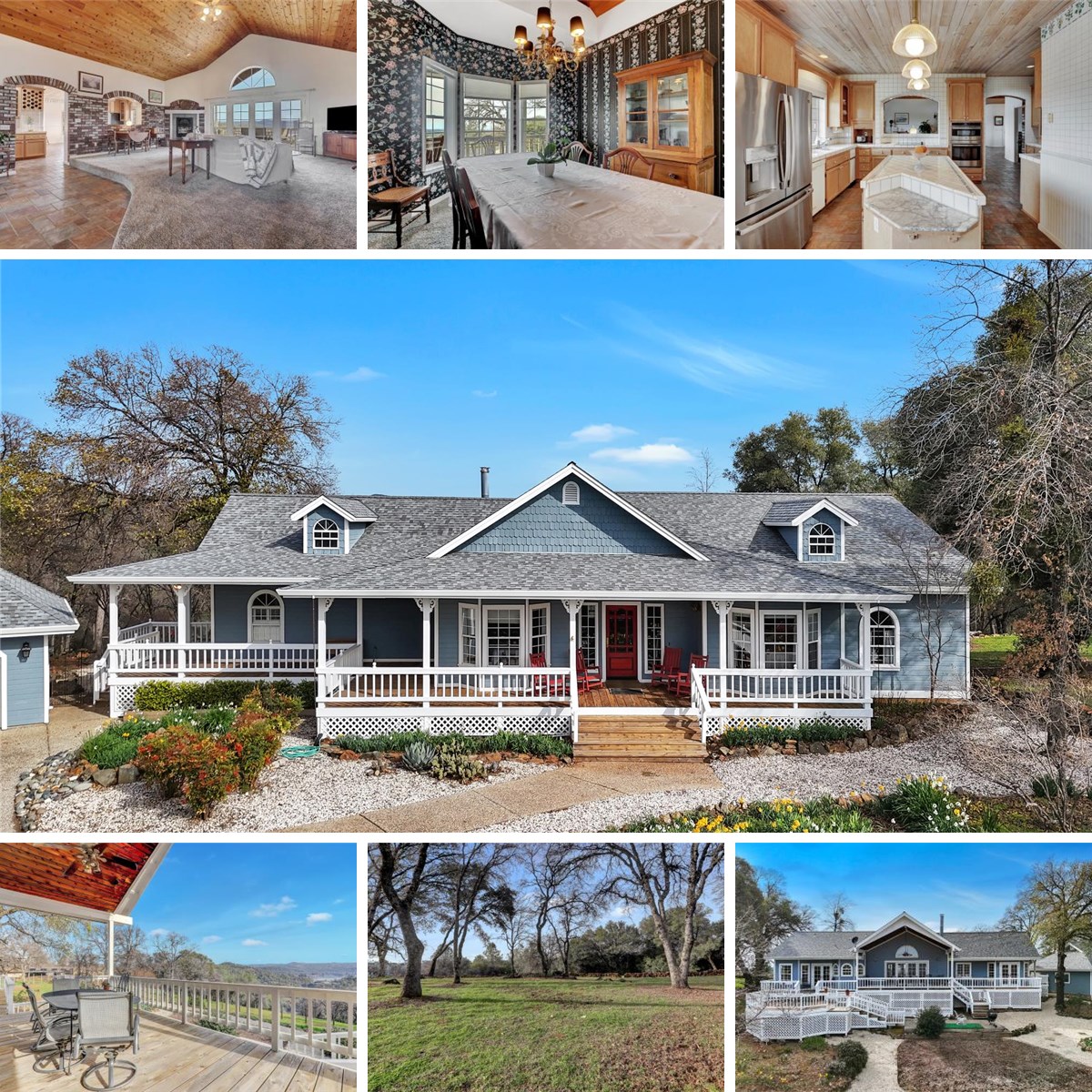 Charming custom farmhouse style with top of the world views! Enjoy lake, river and valley views with gentle paved access and pristine useable land rarely found on panoramic view property. Expansive decking wraps around home perfect for entertaining! Peaceful and private, you can see and hear the waterfall in the river and see Lake Wildwood as well from home and cantilevered back decking leading to gardens. Home has huge open living room to enjoy the views with cathedral knotty pine ceiling, wood burning fireplace and pretty rounded wall entering into formal dining. Brick arched accent pass-through to open kitchen featuring custom cabinets, island, updated appliances, wet bar, pantry and large breakfast area with lovely accents and wainscoting. Master bedroom continues the design including wainscoting, Brazilian cherry flooring and large master bathroom and shower with dual heads. Guest rooms also have beautiful cherry wood floors and Jack and Jill bath with antique vanity and mirror. Four car garage with drop down stairway for storage above and large workbench. Pride of ownership shows in the impeccable maintenance of this home and property!